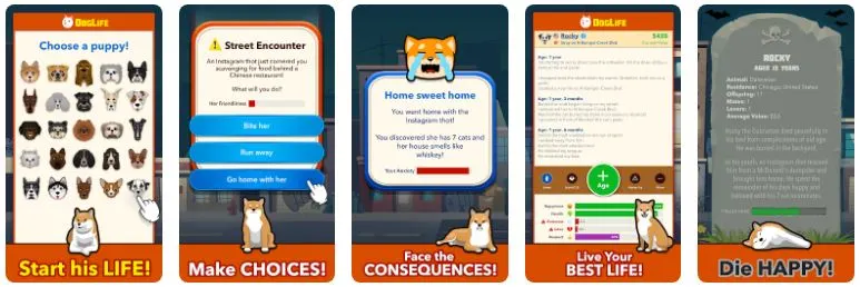 Every day brings a new challenge in the dog’s world. Maybe a pet store worker forgets to close your cage—what will you do? Will you run outside to explore the world, stay and wait for an owner, or try to make friends with another dog? These small choices lead to a unique story that shapes your entire journey.